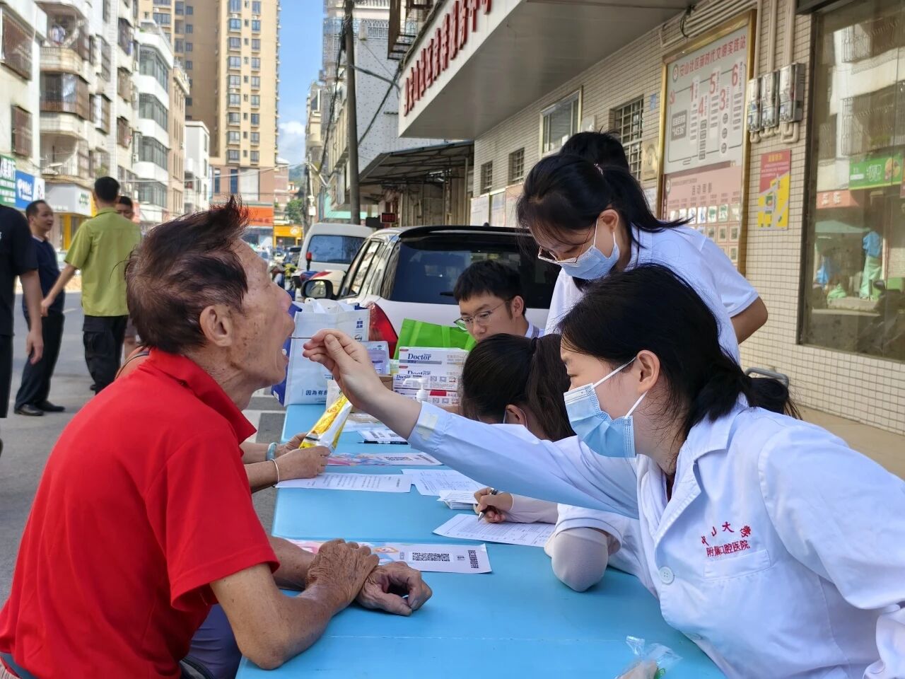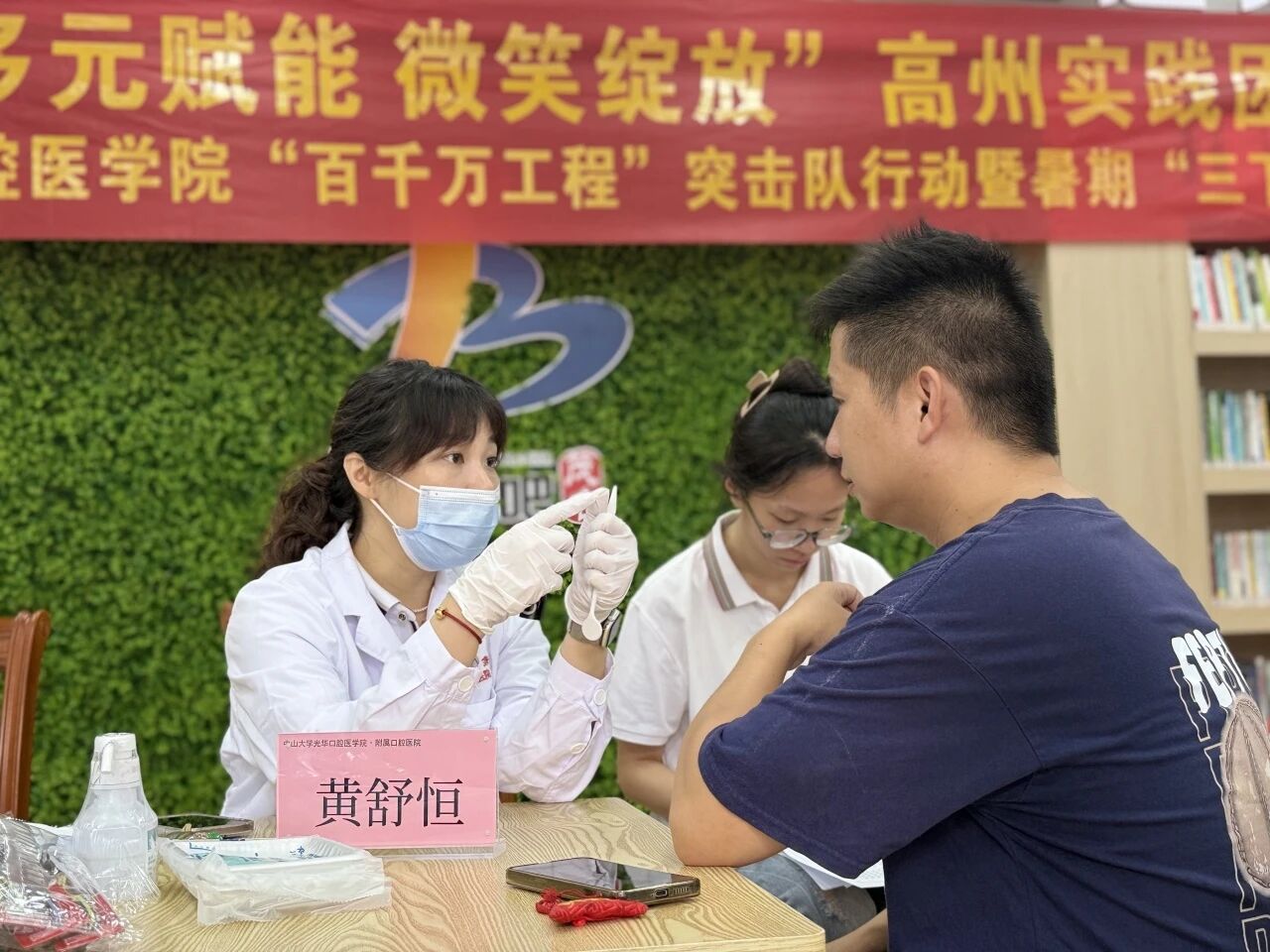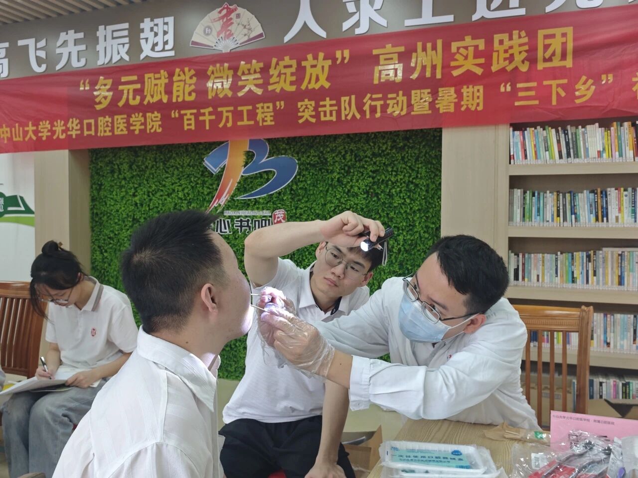 为切实践行习近平总书记对新时代青年的殷切嘱托,响应团中央深化实践育人、服务国家战略的号召,服务学校“双百行动”中心工作大局,7月8日至11日,中山大学光华口腔医学院“多元赋能 微笑绽放”高州实践团带着专业与热忱,首次采用“义诊+调研”的巡诊方式,以“研究生+本科生”结对方式对高州市28个乡镇及街道,进行了全覆盖的口腔健康义诊宣教、免费涂氟、居民口腔健康水平及医疗服务需求的实践调研,共计服务超过3000名群众。
