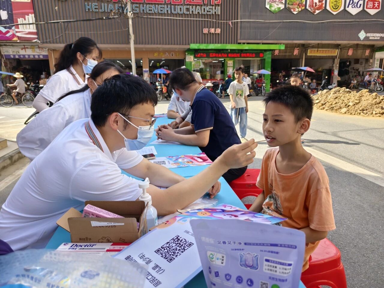 基层乡镇群众的口腔健康始终是团队的关切重点。7月9日、10日上午,实践团分别在曹江镇高凉墟、曹江居委会设点义诊,趁着群众赶集的热闹劲儿,为来往乡亲们提供口腔检查、问题咨询等服务,同时派送牙膏牙刷等口腔保健用品,为当地居民送上家门口的口腔健康关怀。