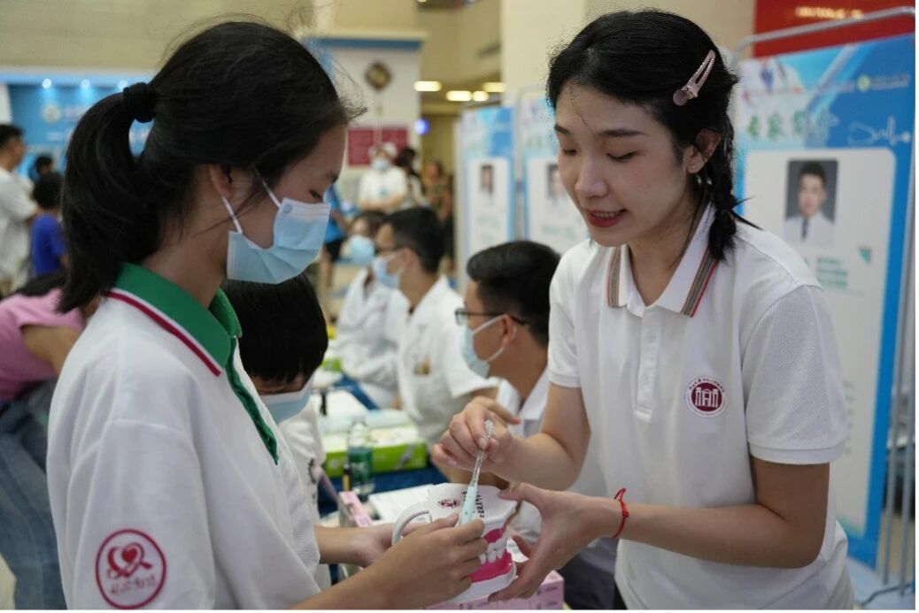 活动现场不仅有专业的诊疗服务,更有干货满满的健康科普环节。“小朋友们,你们知道正确的刷牙方法吗?”现场的医学生志愿者们通过生动有趣的方式教授大家巴氏刷牙法和圆弧刷牙法。