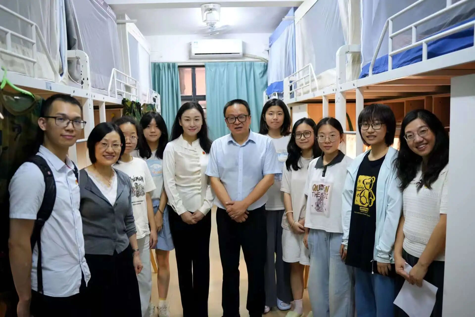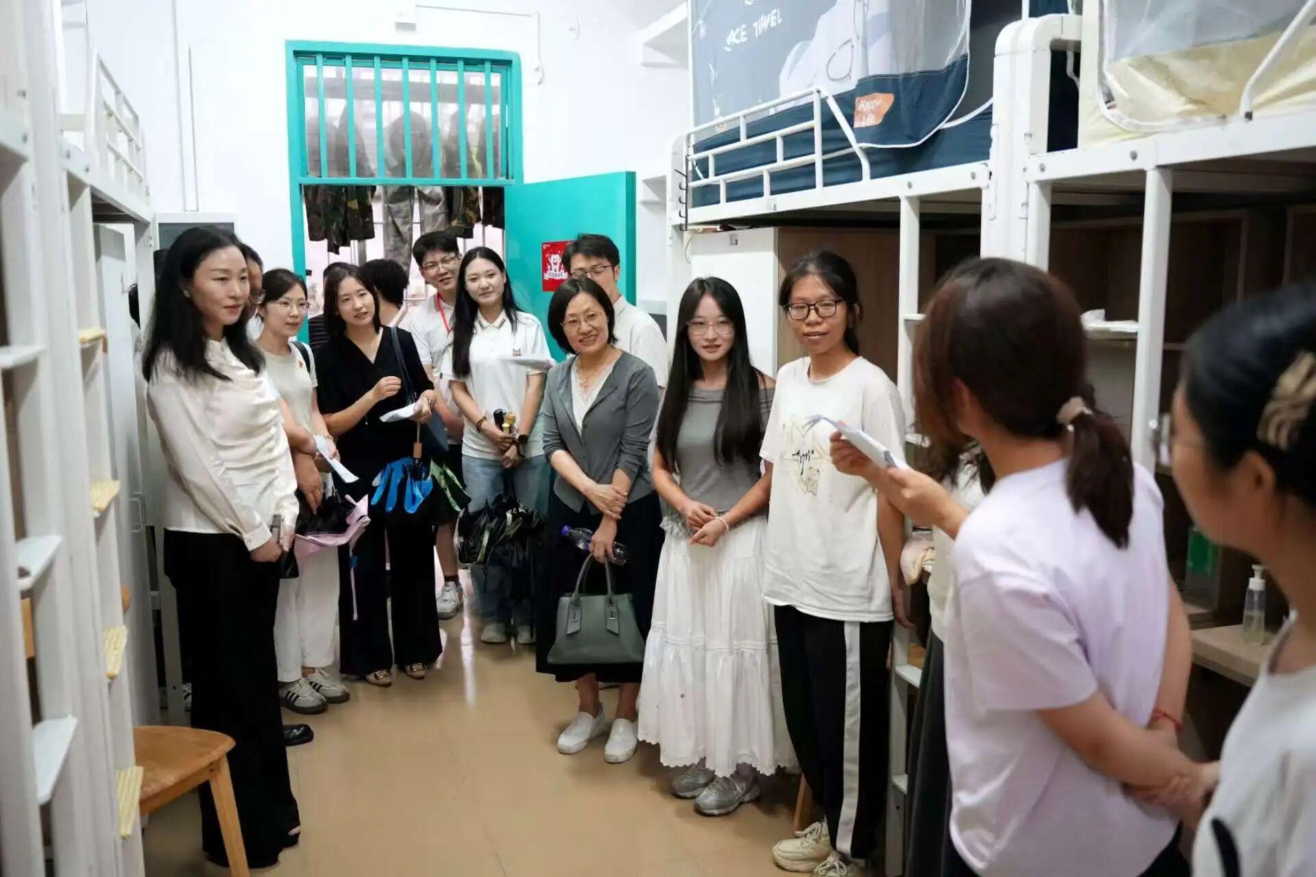 我院陈莉莉院长、党委陈望南书记、吕懿娜副书记带领学生科老师、兼职班主任、兼职辅导员、同伴辅导员和高年级师兄师姐们前往宿舍看望新生,与同学和家长们亲切交流,房间内不时传出朗朗笑声,给同学们带来了暖心的嘱托与关照。